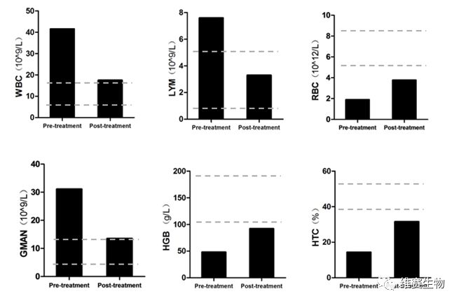 RBC 1.28*10^12/L (5.5-8.5) HGB 40g/L (110-190) HTC 13.0% (39.0-56.0) |