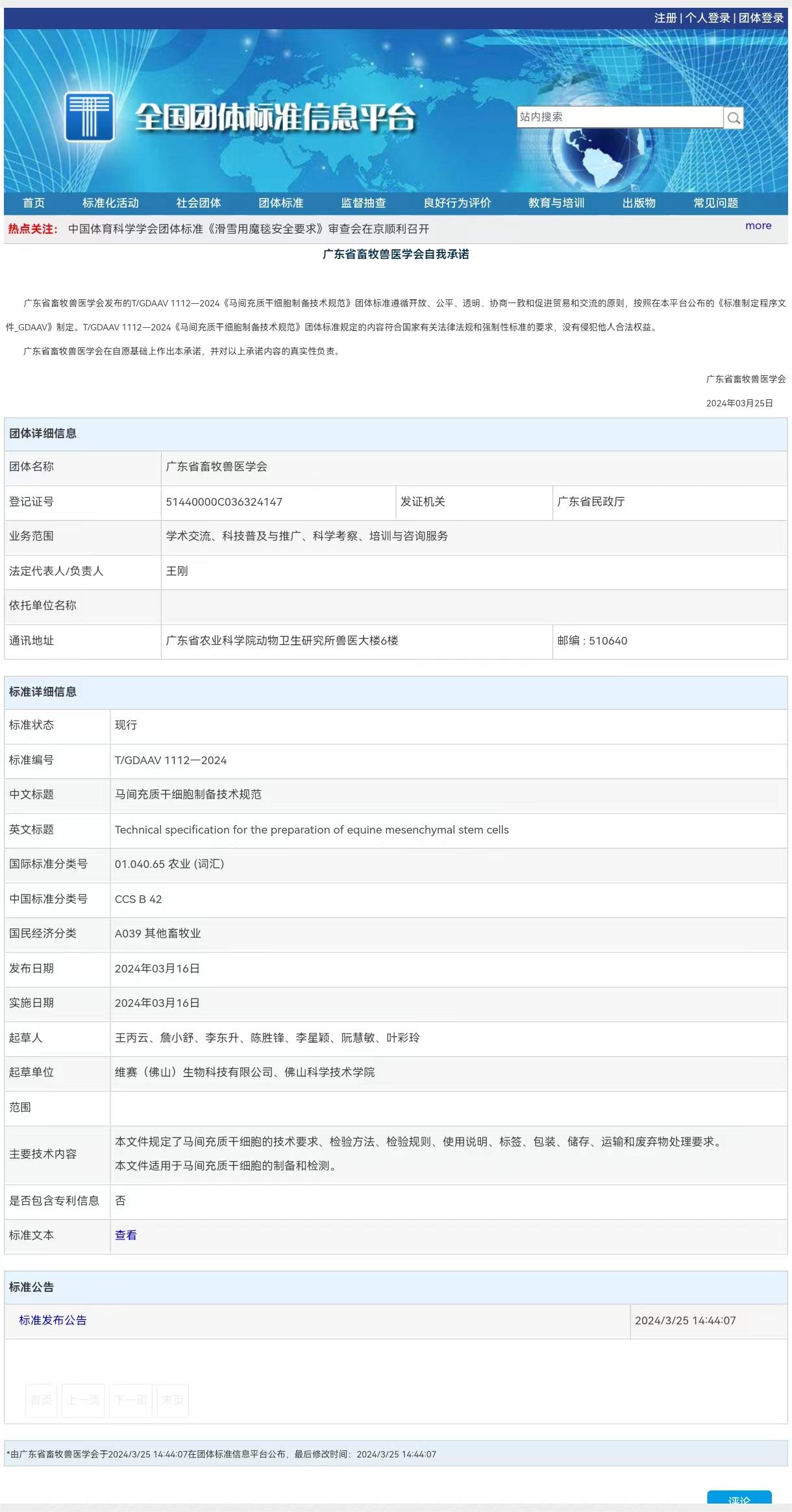 2023年8月维赛(佛山)生物科技有限公司和佛山科学技术学院向广东省畜牧兽医学会提出了《马间充质干细胞制备技术规范》团体标准的申请。经广东省畜牧兽医学会组织专家评审、答辩、修改、社会征求意见和最后审定等环节,于2024年3月16日在全国团体标准信息平台发布。该团体标准详细制定了马间充质干细胞的原材料和辅料、关键质量属性、过程控制、检验方法、检验规则、使用说明、标签、包装、储存和运输等标准,是我国首个有关马干细胞的标准,为我国马的间充质干细胞生产制备以及临床应用提供了依据。