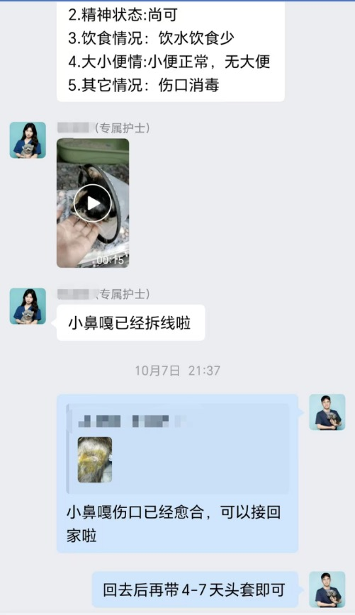 主人带回家后遵医嘱戴头套5日,现已完全康复。