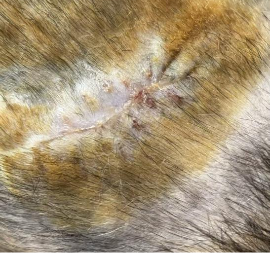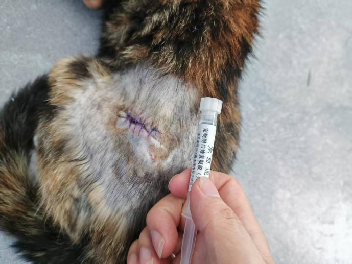 名字:小鼻嘎;品种:田园猫;年龄:1岁;性别:雌性;病史:无;就诊原因:腰侧皮肤不明原因外伤,主人不在意,一周后发现流脓恶臭,前往就医。